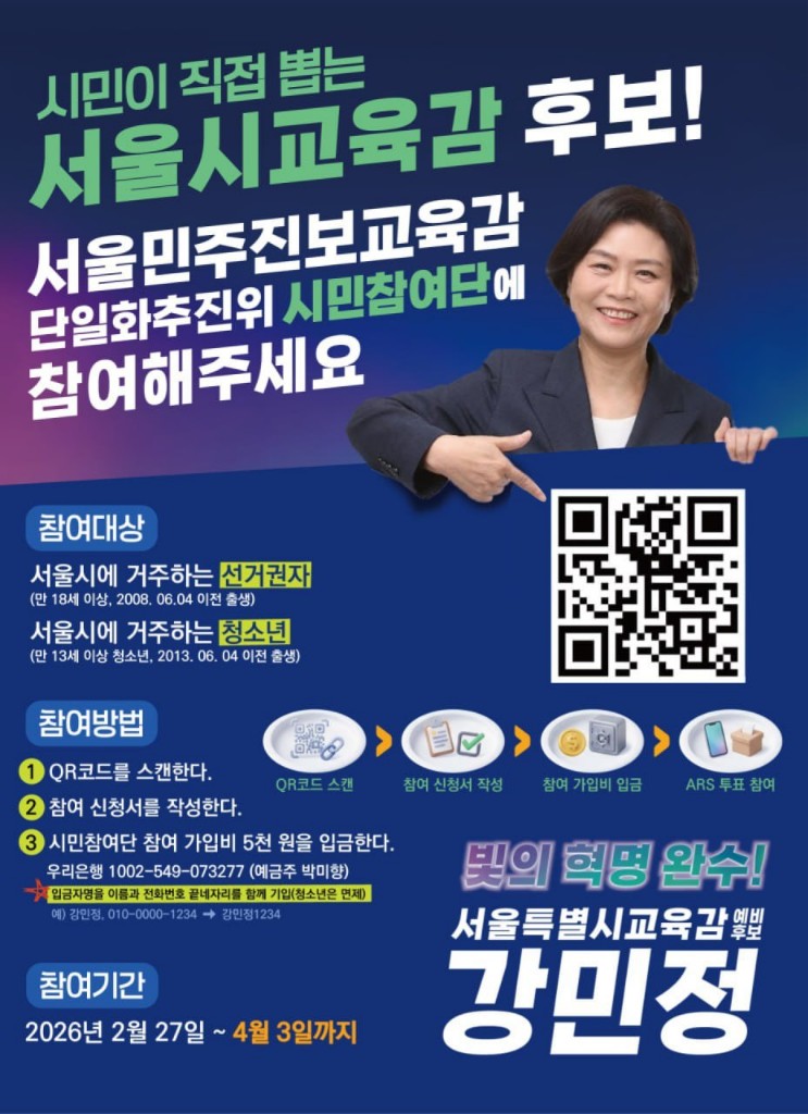 강민정은 24년 동안 중학교 교사로서 현장의 숨결을 아이들과 함께 나눈 사람이다. 그의 여정은 교단에 머물지 않고 국회 교육위원회에서의 4년으로 이어져 입법의 지평을 넓혔다. 세상을 바꾸는 힘의 절반은 제도에 있지만 나머지 절반은 결국 이를 움직이는 사람에게 있음을 그는 안다. 변화의 49%가 실행 주체의 철학에 달려 있다는 그의 통찰은 역사의 지혜와 깊이 맞닿아 있다. 그는 교육감이라는 자리를 탐하는 것이 아니라 교육 자체를 바꾸기 위해 자신을 던지고자 한다. 수식어만 화려한 정치의 시대에 강민정이 보여주는 진정성은 실로 귀하고 드문 덕목이다.