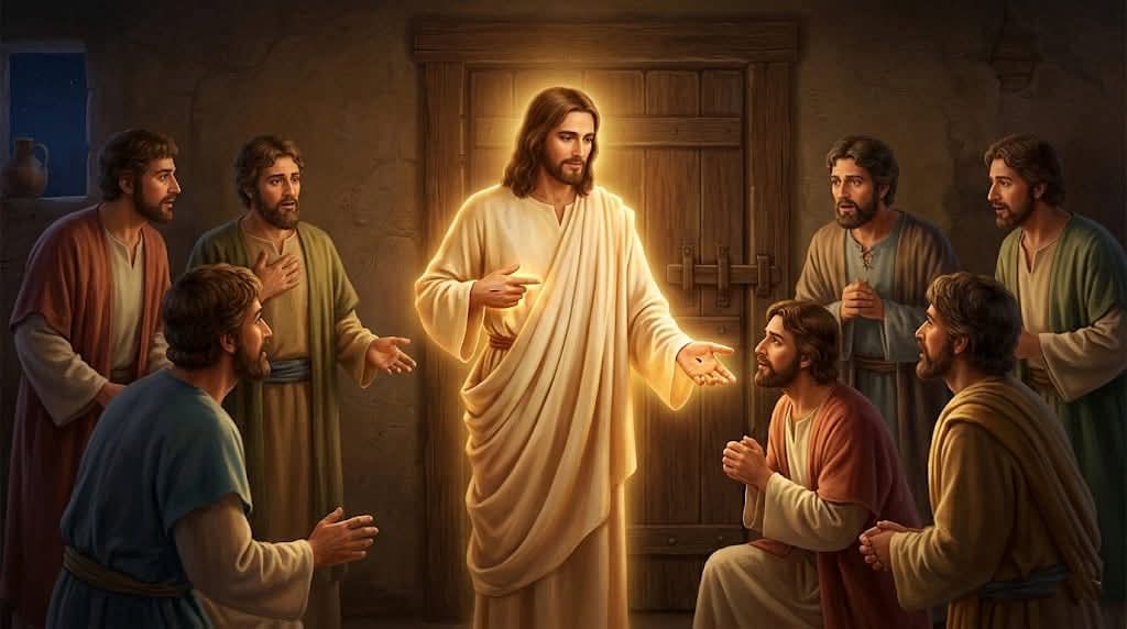 1)그들의 위임을 위한 서언으로 `너희에게 평강이 있을 지어다`라는 앞서 언급되었던 인사가 엄숙하게 반복되고 있다. 앞에서의 인사는 그들의 공포로 인한 동요를 진정시킴으로써 그들로 부의 공포로 인한 동요를 진정시킴으로써 그들로 부활의 증거에 대하여 조용히 경청할 수 있도록 하기 위한 것이었다.